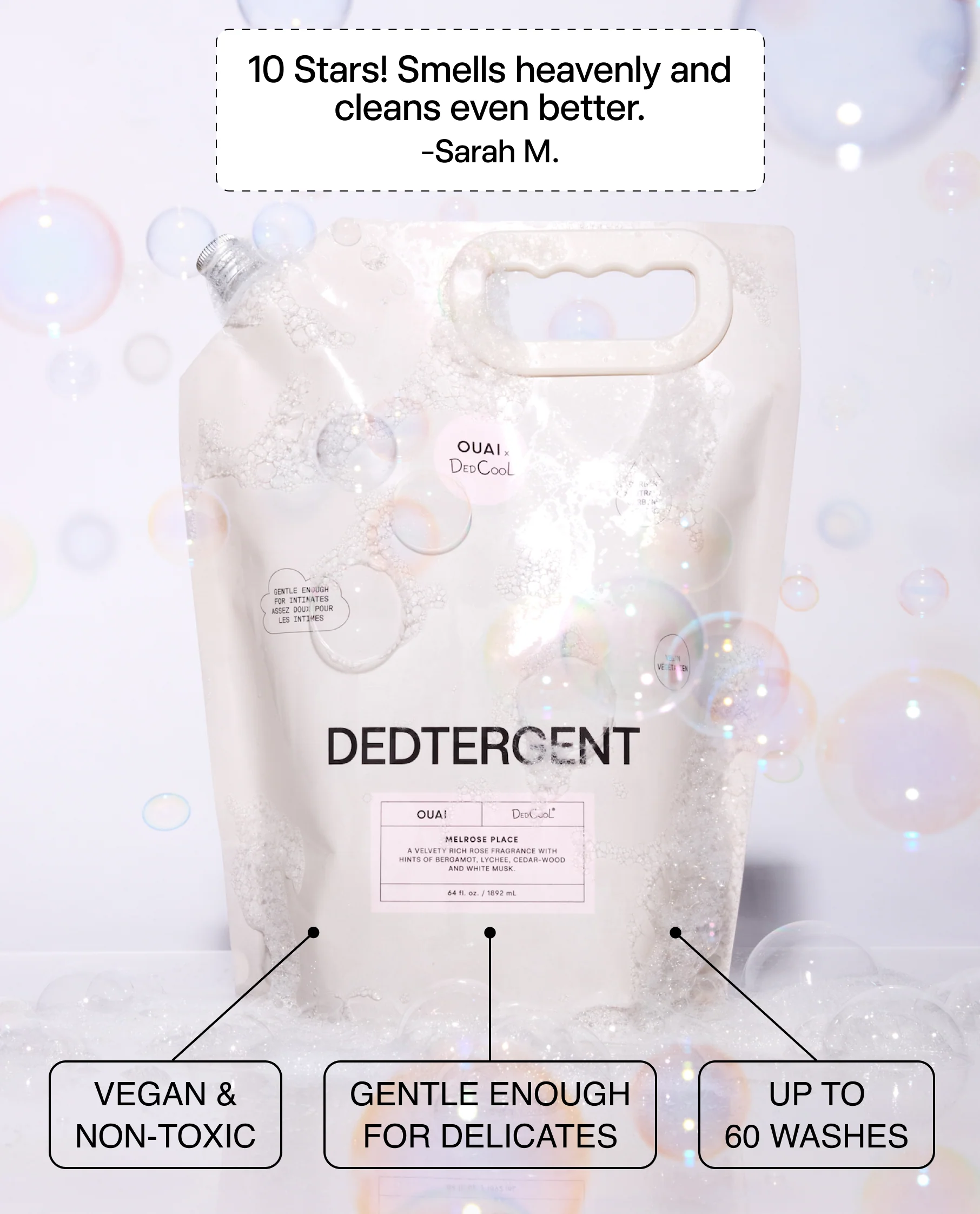 OUAI’s Internet-iconic Melrose Place scent swirls notes of rose, bergamot, + white musk, and combines perfectly with our tried + true Dedtergent formula. Go big - 64oz for two full tin refills or up to 120 loads of laundry.